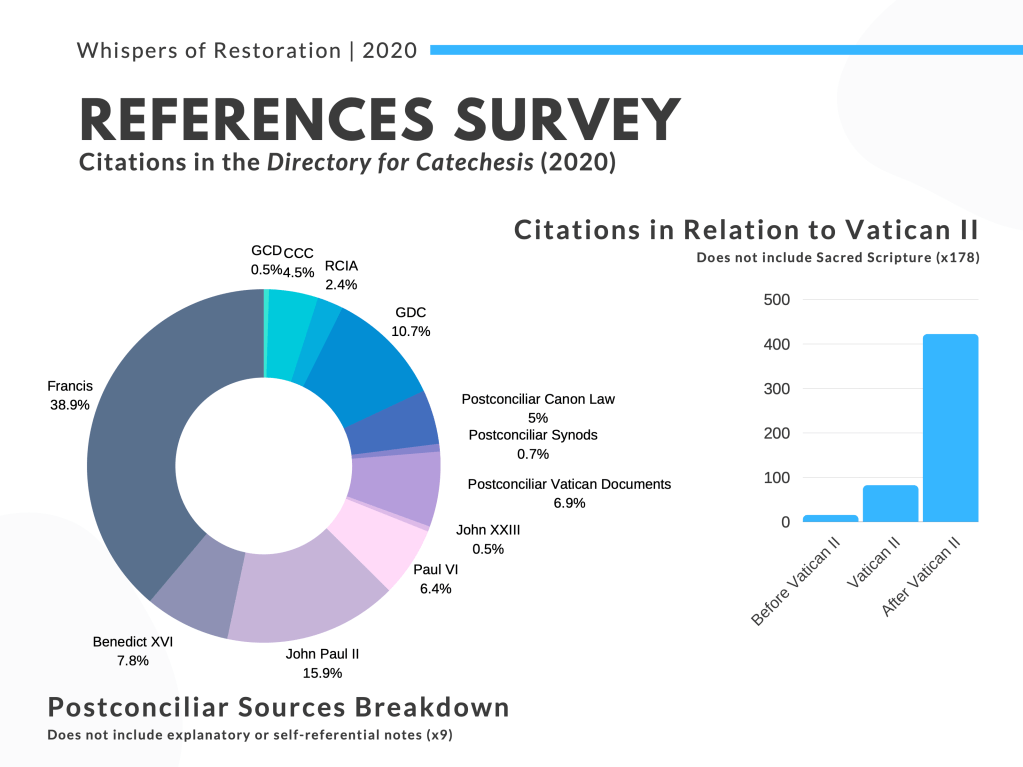 In doing so, one discovers that, even if the DC had referenced thirty times as many sources from the first one thousand, nine hundred and sixty years of Catholic catechetical praxis, the document would still contain 12% more references to postconciliar sources, those dating from only the past fifty-five years. The DC appears to take very seriously its own exhortation to keep “up-to-date” (#135, 370).