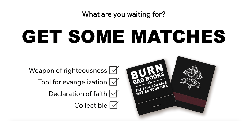 Their website has a helpful smattering of quotations about censorship as well—more than enough to build a Catholic case around. We will definitely be picking up some of their matches, though we can’t help but add another great quote for them to consider for their “Saints Burn Bad Books” section of their website.